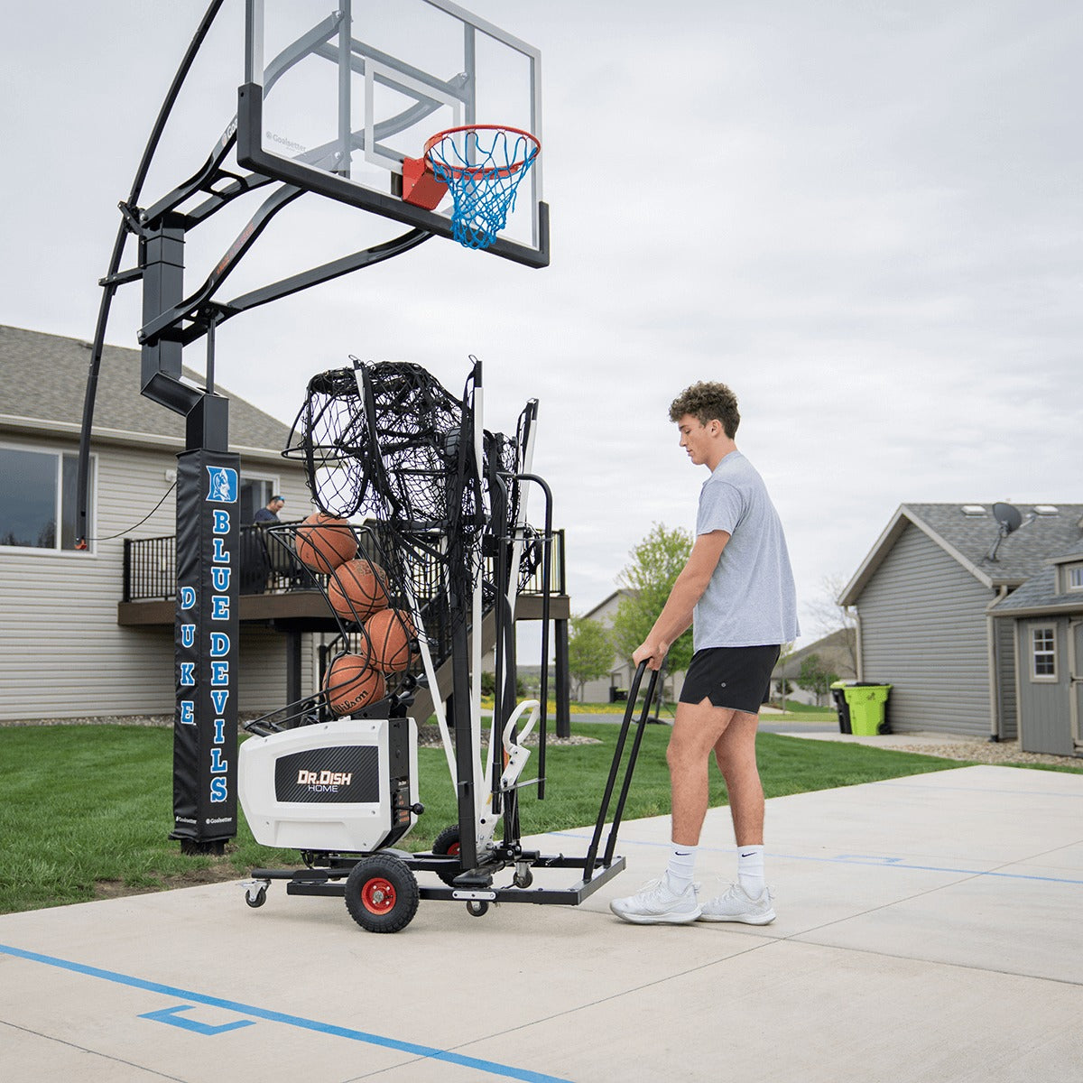 Players of all ages can use a Dr. Dish Home! Any player comfortable shooting on a 10 ft hoop can easily use the Dr. Dish Home with its adjustable net settings at 11’ 6” and 12’ .5”.